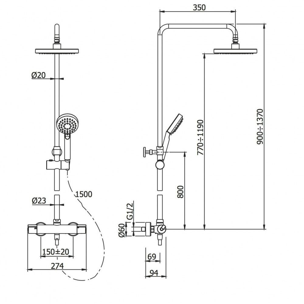 virštinkinė termostatinė dušo sistema su stacionaria galva