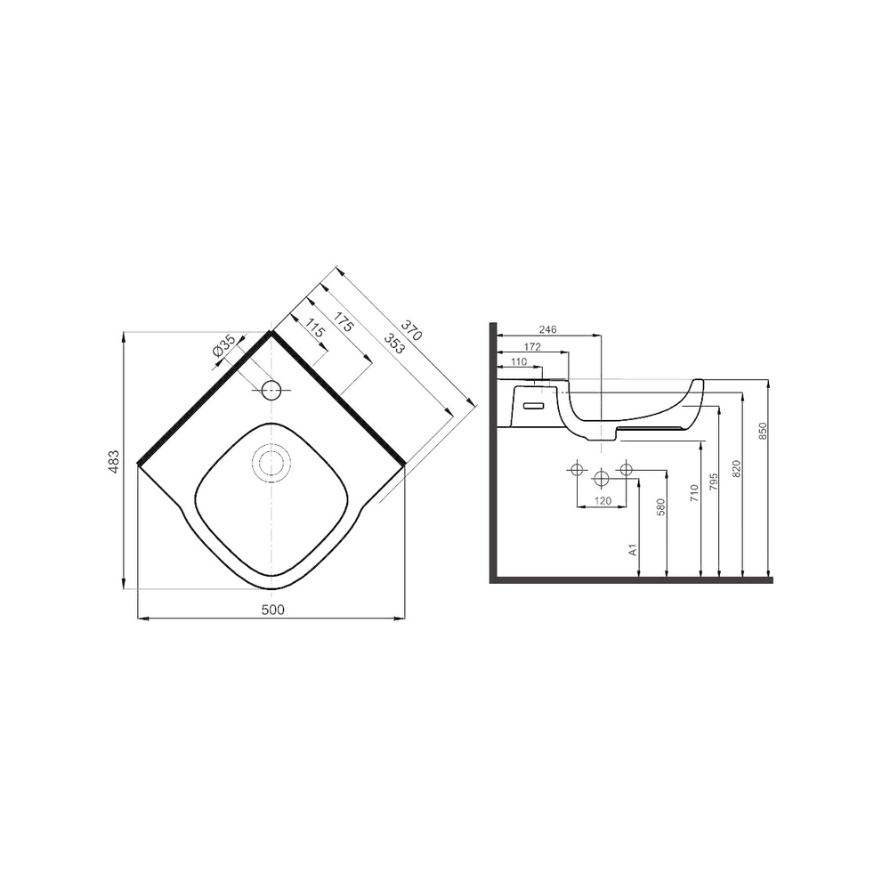 Kampinis praustuvas, su maišytuvo skyle, su perpylimo anga 37 x 50 cm